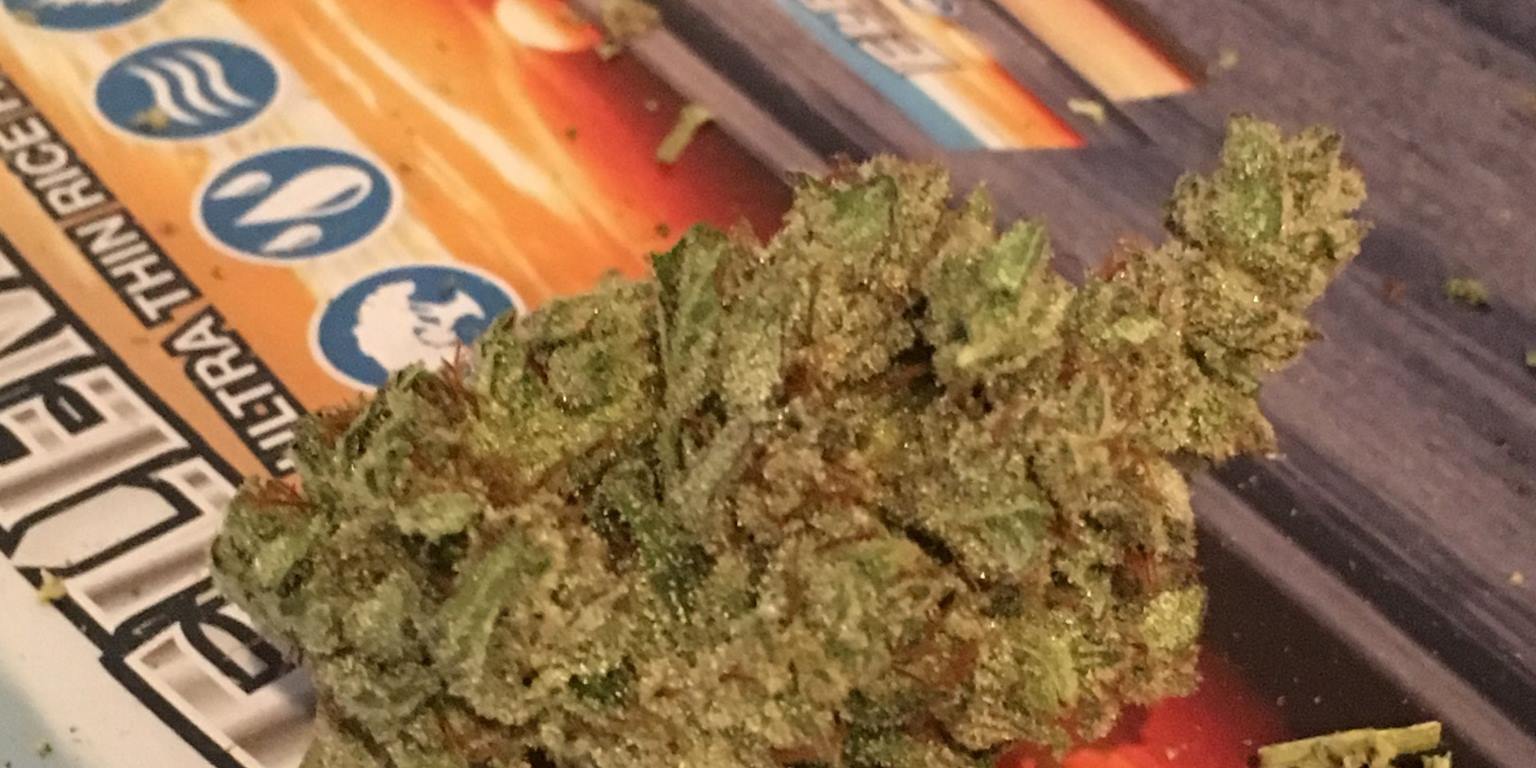 My sample of this one is just one big, gorgeous, light-green bud. It’s got frosting that’d make Tony the Tiger jealous. It has a delicious, sweet aroma that instantly makes me think of the Cookie strains. I’ve had some Platinum Girl Scout Cookies from Tahoma Flavors out in Seattle and that batch left me unfulfilled, so I was a bit disheartened when I only had a light head buzz after the first bowl of this Secret Cup entry.